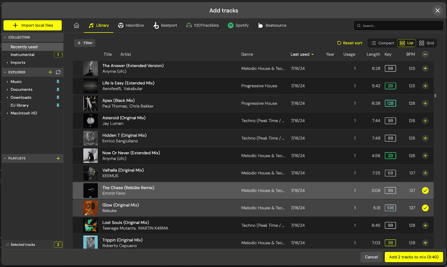 You can add tracks with the yellow Import local files button or browse music from 3rd party software libraries like rekordbox etc.