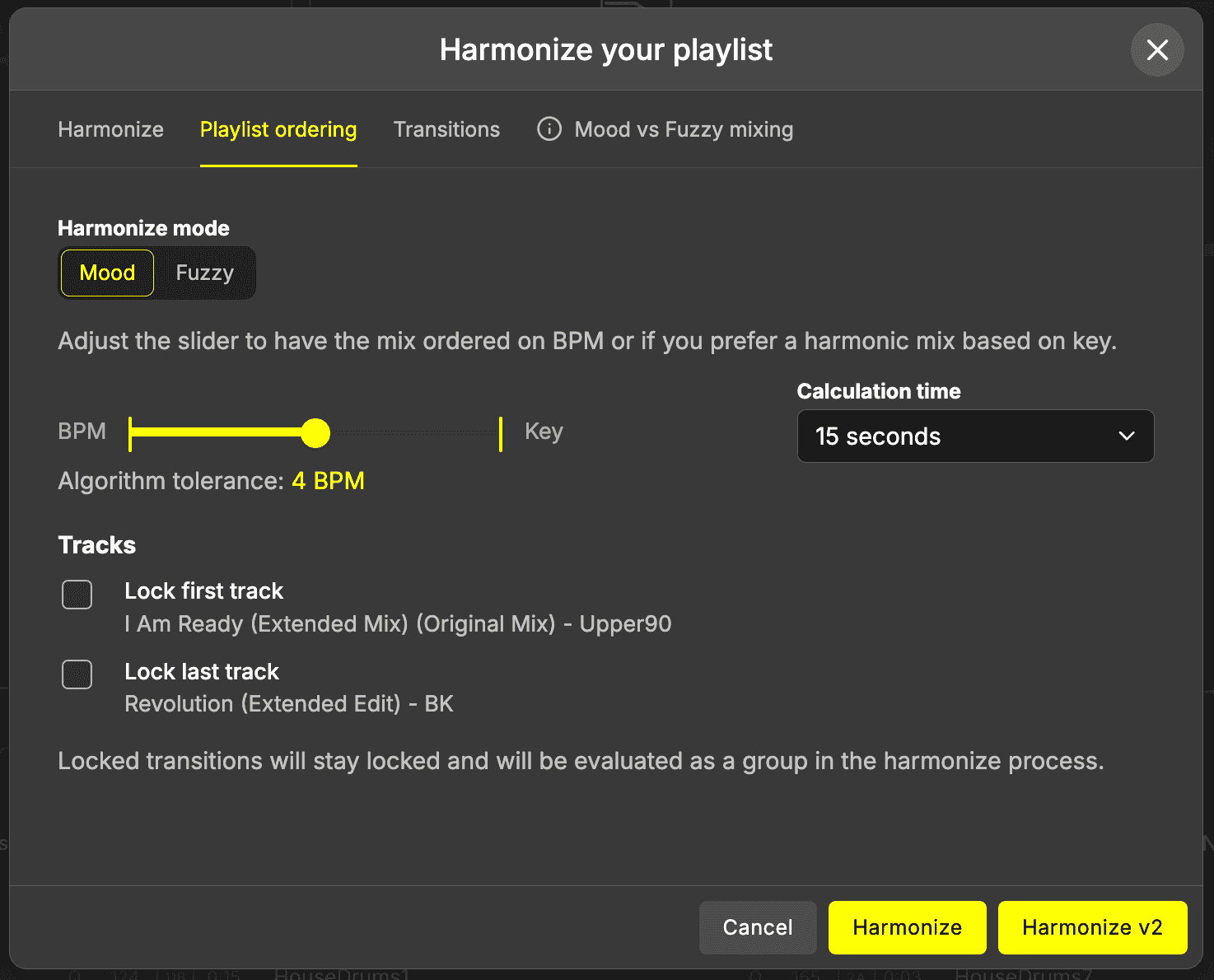 Lock first track: if you have already decided which track you want to start your mix with, make sure the track is the first song in your mix. Check this box to make sure Harmonize will start with this track.