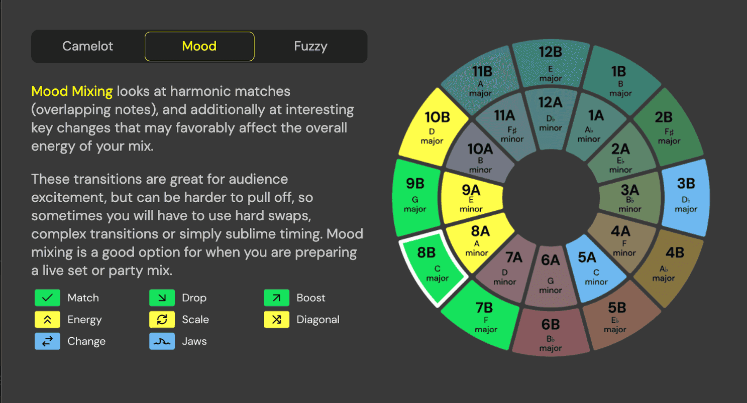 For example, in traditional Camelot Wheel/Harmonic Mixing, a song in 8A would be suggested to mix with the same key (8A), 7A, 8B, or 9A.
